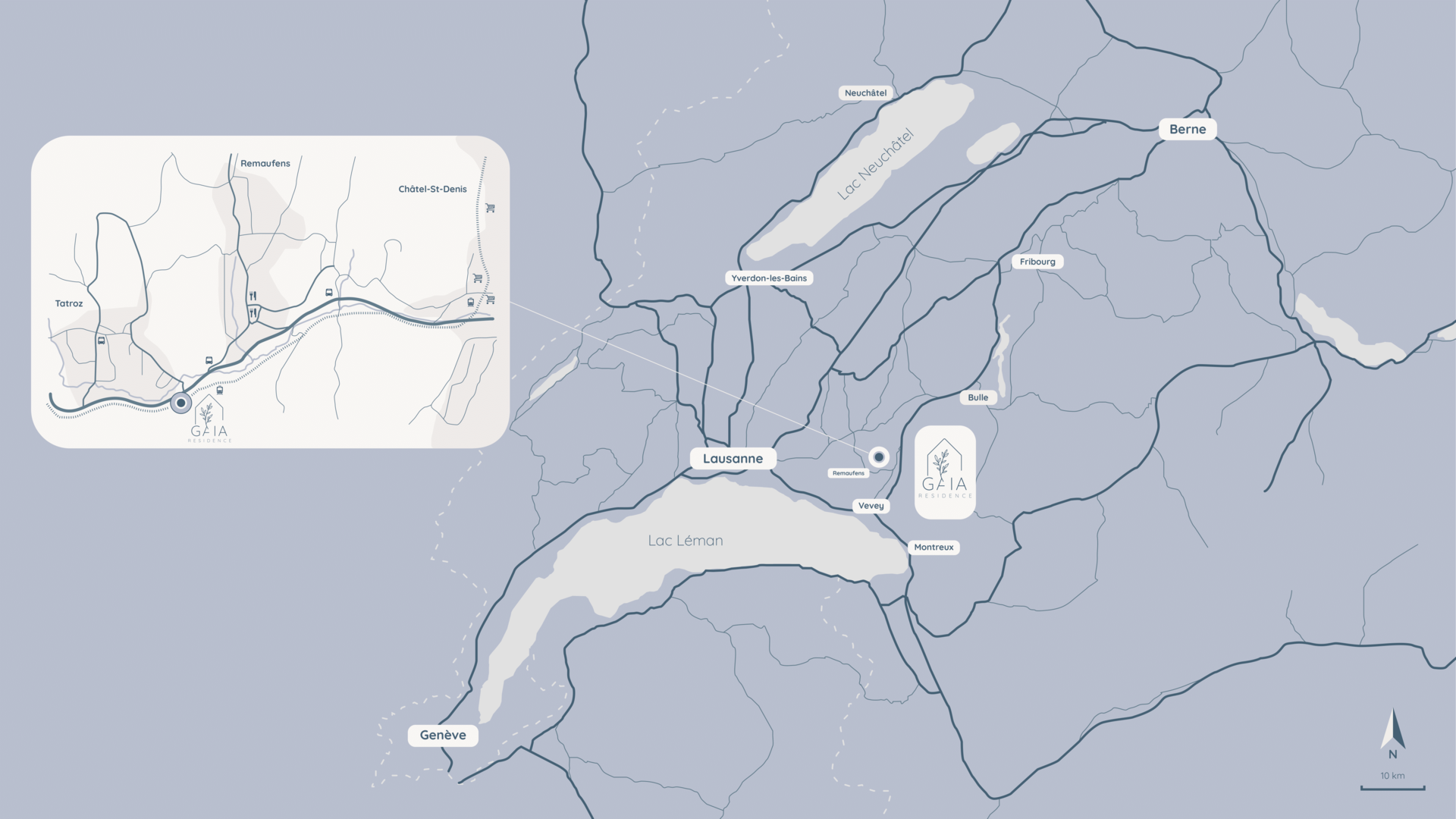 À seulement 3 minutes de Châtel-Saint-Denis, 15 minutes de Vevey et de la Riviera vaudoise, 35 minutes de Lausanne ou Fribourg et 1h15 de Genève, Remaufens bénéficie d’une situation privilégiée, idéale pour les familles comme pour les actifs. L’autoroute toute proche assure un accès rapide aux principaux centres de Suisse romande.