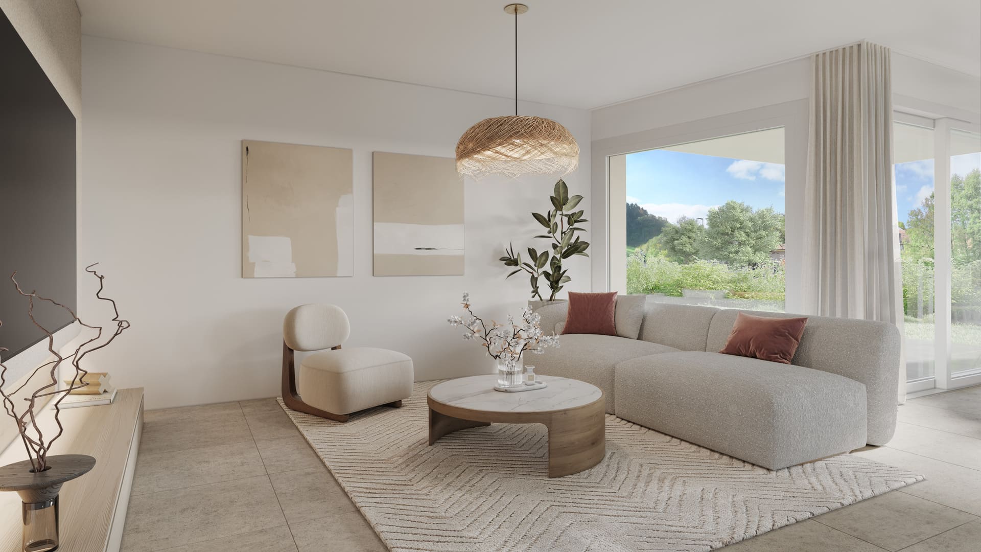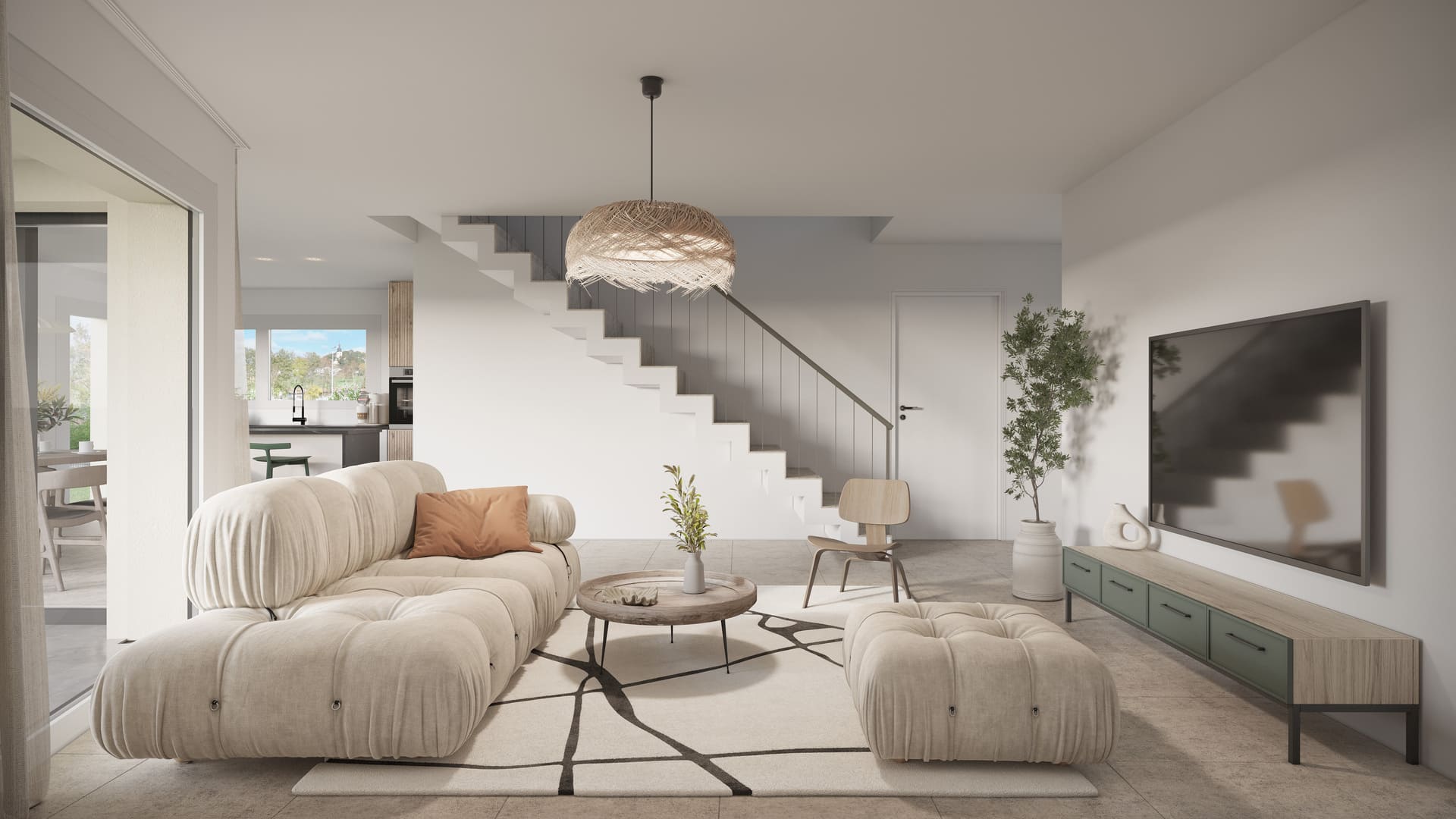 • Grand séjour avec salle à manger • Cuisine ouverte avec îlot (selon choix) • Accès direct à la terrasse et au jardin • WC visiteurs et espaces de rangement